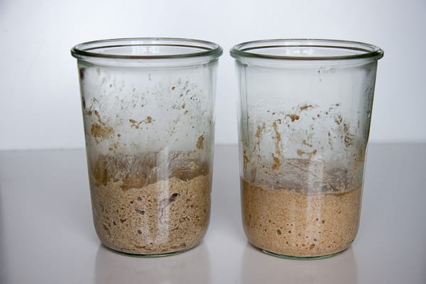 Sauerteigansatz 2. Tag-1 22. September 2016 Schreibe einen Kommentar 2. Tag: Roggen links, Weizen rechts